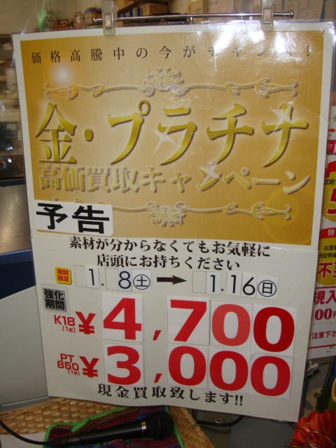 【売り切れました】今が売り時!貴金属キャンペーン16日まで。急いで!!