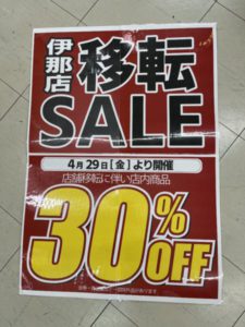 【終了しました】伊那店 引っ越しするってよ スマイルサンタ伊那店 29日から移転の為 セール突します。 会員様限定30%OFF  突然ですが。GWですし。 Out of the blue