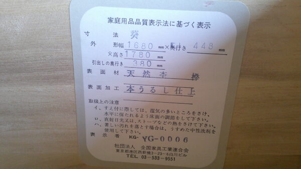 ↑材質は「欅」でこちらのシールにサイズの表記があります。